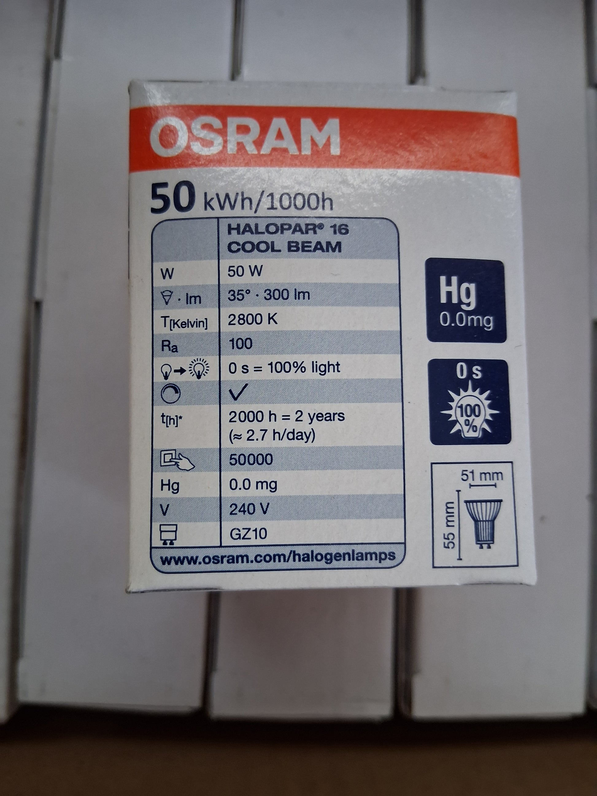 The OSRAM 50 watt Halopar 16 GZ10 240V flood light delivers precision illumination with a cool beam characteristic ideal for accent lighting and display applications. This professional-grade halogen lamp features the GZ10 base configuration and operates at 240 volts, making it compatible with standard UK electrical systems. The cool beam output provides crisp, bright light suitable for retail environments, galleries, and architectural highlighting. Built to OSRAM's exacting standards, this lamp offers reliable performance and consistent colour temperature. Perfect for upgrading existing flood lighting installations or creating focused illumination effects where precision matters. 300lm.